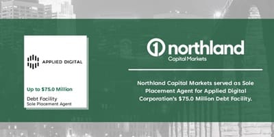 September 22, 2025NCM: Served as Sole Placement Agent for Applied Digital Corporation’s $75.0M Debt FacilityNorthland Capital Markets served as Sole Placement Agent for Applied Digital Corporation’s $75.0 Million Debt Facility. Northland Capital Markets’ Investment Banking group serves corporate clients by providing the financing services they need, with the experience and commitment to get the results they seek.