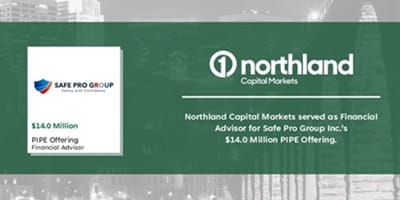 October 22, 2025NCM: Served as Financial Advisor for Safe Pro Group Inc.’s $14.0 Million PIPE OfferingNorthland Capital Markets served as Financial Advisor for Safe Pro Group Inc.’s $14.0 Million PIPE Offering. Northland Capital Markets’ Investment Banking group serves corporate clients by providing the financing services they need, with the experience and commitment to get the results they seek.