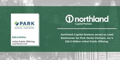 December 4, 2025NCM: Served As Lead Bookrunner for Park Dental Partners, Inc.’s $20.0 Million Initial Public OfferingNorthland Capital Markets served as Lead Bookrunner for Park Dental Partners, Inc.’s $20.0 Million Initial Public Offering. Northland Capital Markets’ Investment Banking group serves corporate clients by providing the financing services they need, with the experience and commitment to get the results they seek.