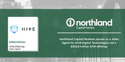 December 4, 2025NCM: Served as a Sales Agent for HIVE Digital Technologies Ltd.’s $300.0 Million ATM OfferingNorthland Capital Markets served as a Sales Agent for HIVE Digital Technologies Ltd.’s $300.0 million ATM offering. Northland Capital Markets’ Investment Banking group serves corporate clients by providing the financing services they need, with the experience and commitment to get the results they seek.