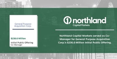 December 5, 2025NCM: Served as Co-Manager for General Purpose Acquisition Corp.’s $230.0 Million Initial Public OfferingNorthland Capital Markets served as Co-Manager for General Purpose Acquisition Corp.’s $230.0 Million Initial Public Offering. Northland Capital Markets’ Investment Banking group serves corporate clients by providing the financing services they need, with the experience and commitment to get the results they seek.