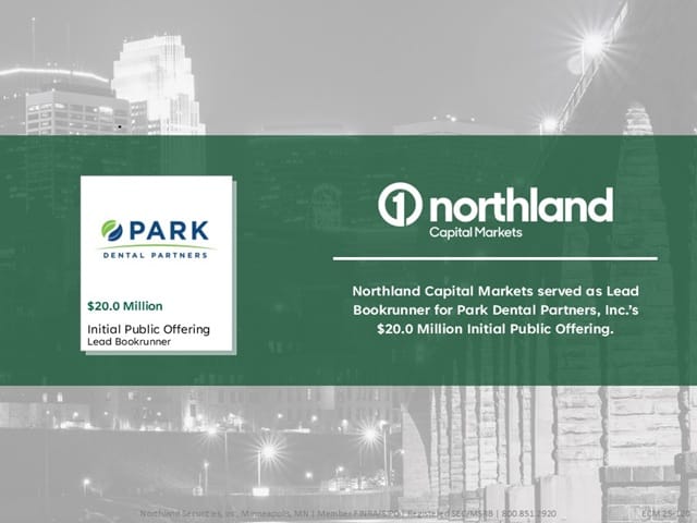 December 4, 2025 NCM: Served As Lead Bookrunner for Park Dental Partners, Inc.’s $20.0 Million Initial Public Offering Northland Capital Markets served as Lead Bookrunner for Park Dental Partners, Inc.’s $20.0 Million Initial Public Offering. Northland Capital Markets’ Investment Banking group serves corporate clients by providing the financing services they need, with the experience and commitment to get the results they seek.