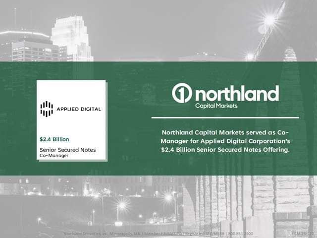 December 4, 2025 NCM: Served as Co-Manager for Applied Digital Corp.’s $2.4 Billion Senior Secured Notes Offering Northland Capital Markets served as Co-Manager for Applied Digital Corporation’s $2.4 Billion Senior Secured Notes Offering. Northland Capital Markets’ Investment Banking group serves corporate clients by providing the financing services they need, with the experience and commitment to get the results they seek.