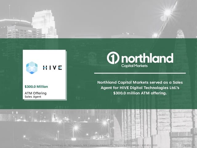 December 4, 2025 NCM: Served as a Sales Agent for HIVE Digital Technologies Ltd.’s $300.0 Million ATM Offering Northland Capital Markets served as a Sales Agent for HIVE Digital Technologies Ltd.’s $300.0 million ATM offering. Northland Capital Markets’ Investment Banking group serves corporate clients by providing the financing services they need, with the experience and commitment to get the results they seek.