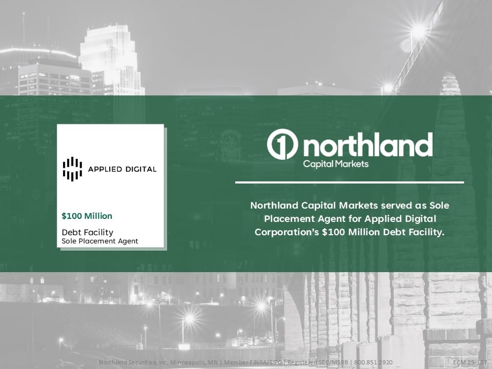 January 2, 2026 NCM: Served as Sole Placement Agent for Applied Digital Corp’s $100 Million Debt Facility Northland Capital Markets served as Sole Placement Agent for Applied Digital Corporation’s $100 Million Debt Facility. Northland Capital Markets’ Investment Banking group serves corporate clients by providing the financing services they need, with the experience and commitment to get the results they seek.