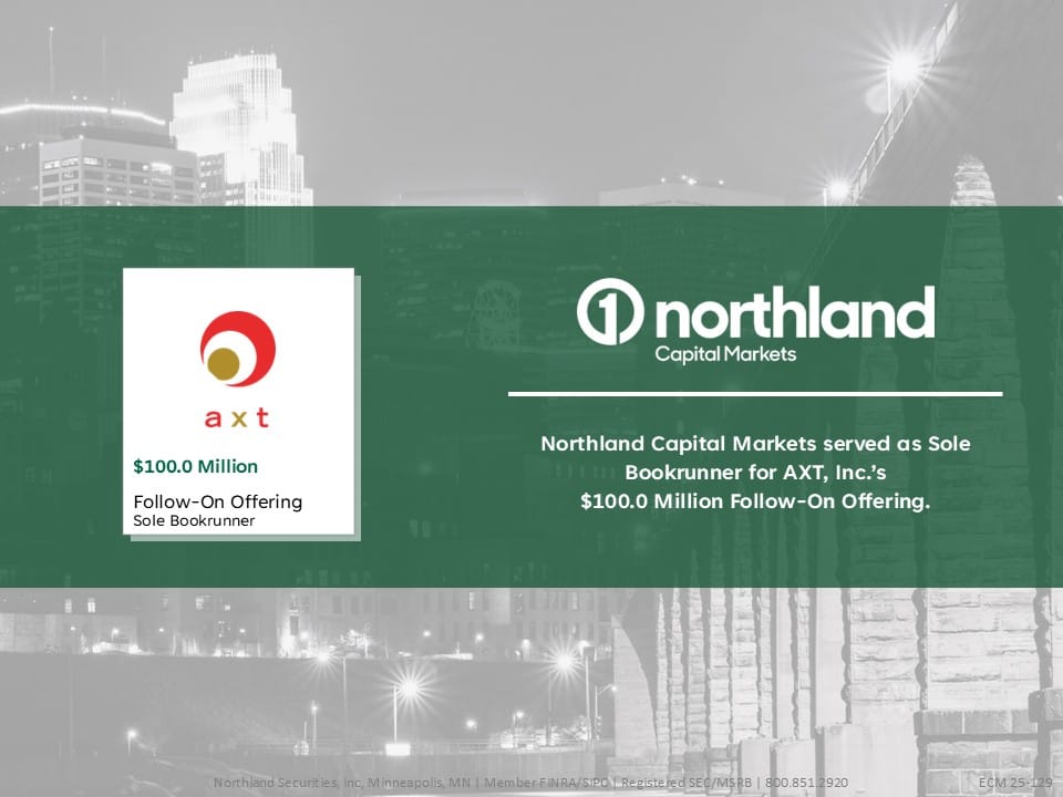 January 2, 2026 NCM: Served as Sole Bookrunner for AXT, Inc.’s $100 Million Follow-On Offering Northland Capital Markets served as Sole Bookrunner for AXT, Inc.’s $100 Million Follow-On Offering. Northland Capital Markets’ Investment Banking group serves corporate clients by providing the financing services they need, with the experience and commitment to get the results they seek.