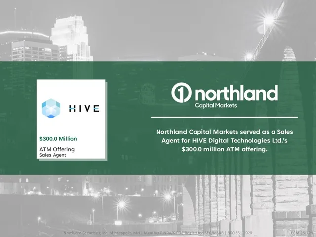 NCM: Served as a Sales Agent for HIVE Digital Technologies Ltd.’s $300.0 Million ATM Offering December 4, 2025 Northland Capital Markets served as a Sales Agent for HIVE Digital Technologies Ltd.’s $300.0 million ATM offering. Northland Capital Markets’ Investment Banking group serves corporate clients by providing the financing services they need, with the experience and commitment to get the results they seek.