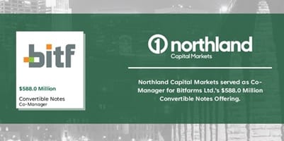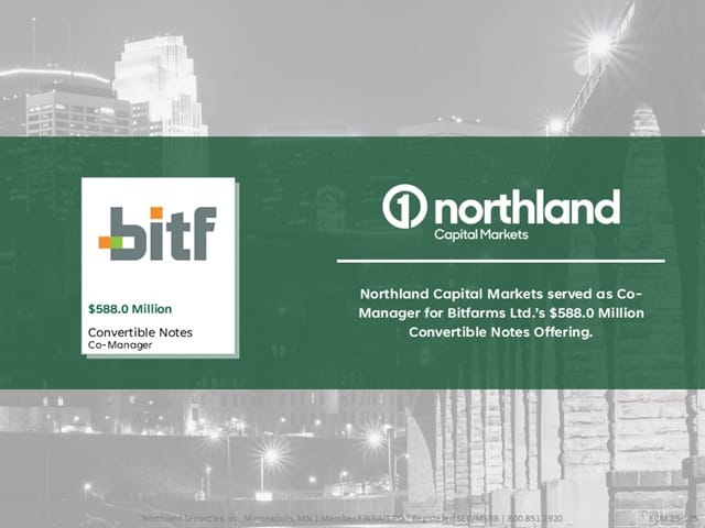 NCM: Served as Co-Manager for Bitfarms Ltd.’s $588.0 Million Convertible Notes Offering October 24, 2025 Northland Capital Markets served as Co-Manager for Bitfarms Ltd.’s $588.0 Million Convertible Notes Offering. Northland Capital Markets’ Investment Banking group serves corporate clients by providing the financing services they need, with the experience and commitment to get the results they seek.